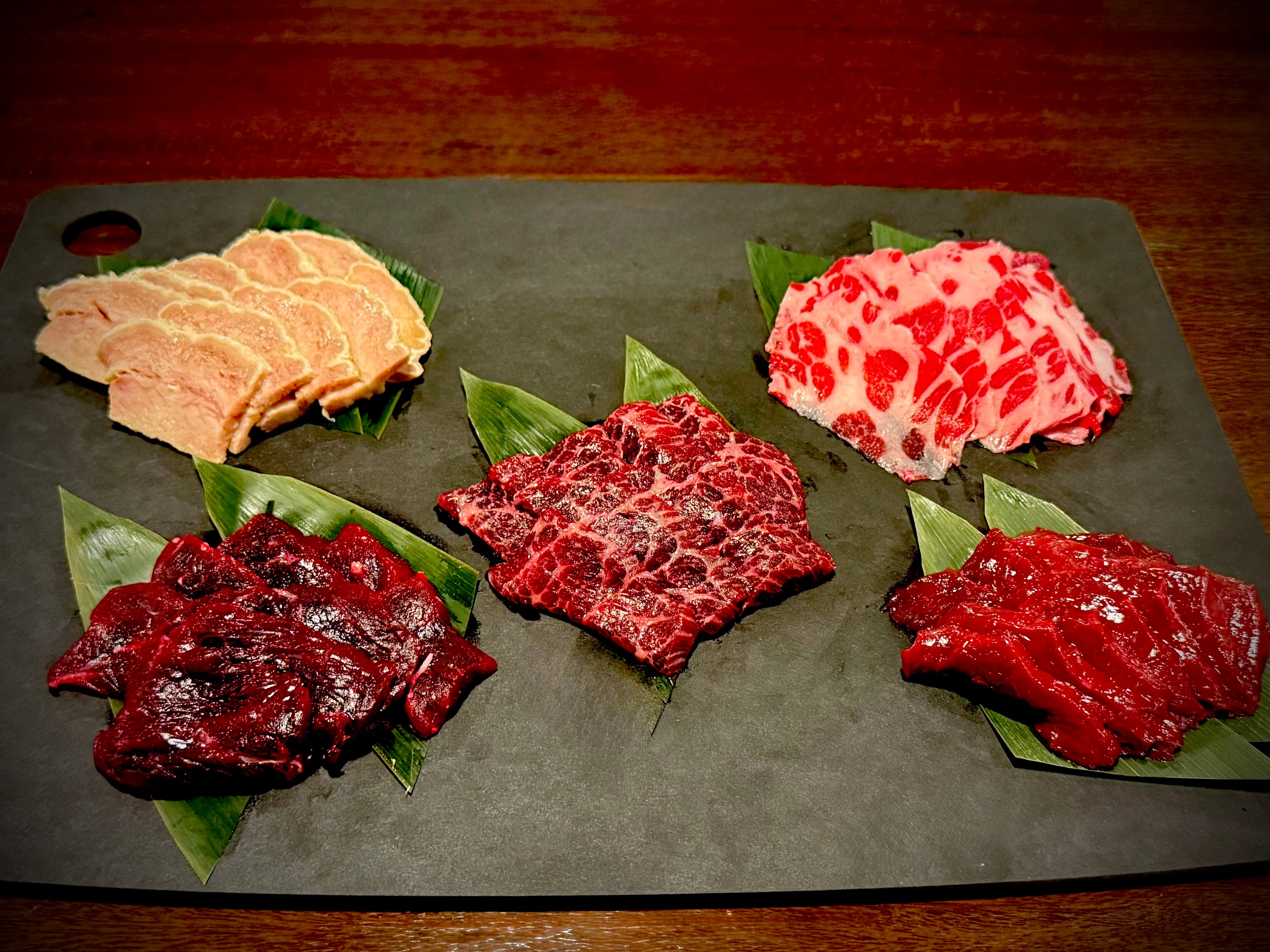 【内容量】上赤身(背肉)・尾の身(尾肉)・鹿の子(アゴ肉)・ハツ(心臓)・百畳(胃袋) 各100g [冷凍品]